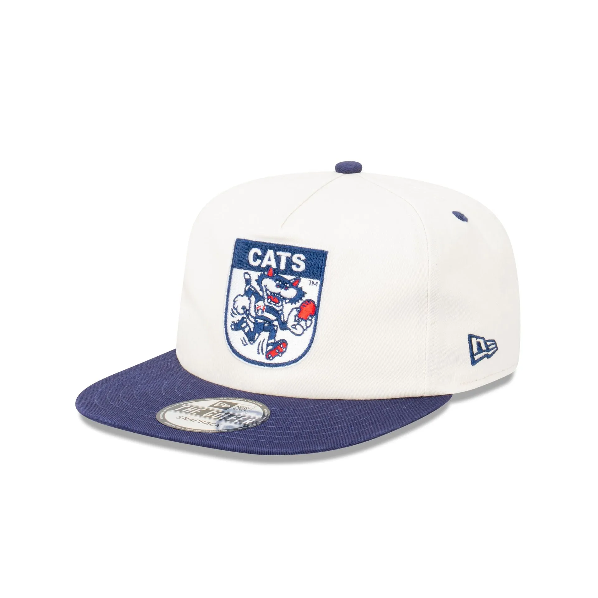 The Geelong Cats Two-Tone Retro The Golfer Snapback, features a Flat Geelong Cats Retro Logo on the front of a White Crown and Navy Visor. Additional features include a New Era Flag Logo on the left side.